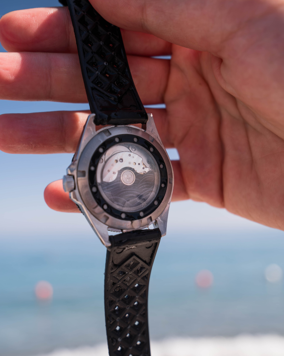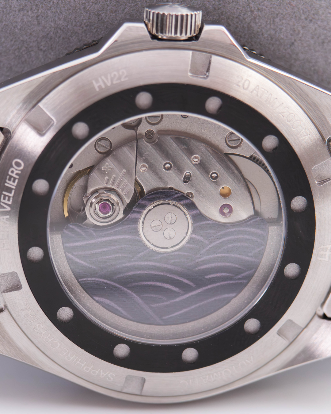 - Fondello: A vite con vetro zaffiro trasparente, che ricrea l’oblò di una nave, lasciando intravedere un mare in tempesta rappresentato dalla massa oscillante